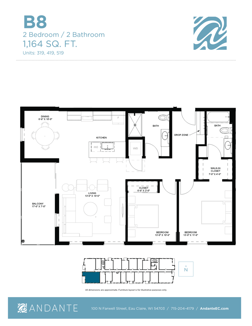 This is a 2 Bedroom, 2 Bathroom unit located in Andante with one underground parking stall included in rent. Andante is a 5-story mixed-use development located at 100 N. Farwell Street, in the heart of downtown Eau Claire. The project includes 76 residential units, including furnished studios, one-bedroom units, and two-bedroom units. The first floor of the building includes over 8,000 leasable square feet of commercial space.
