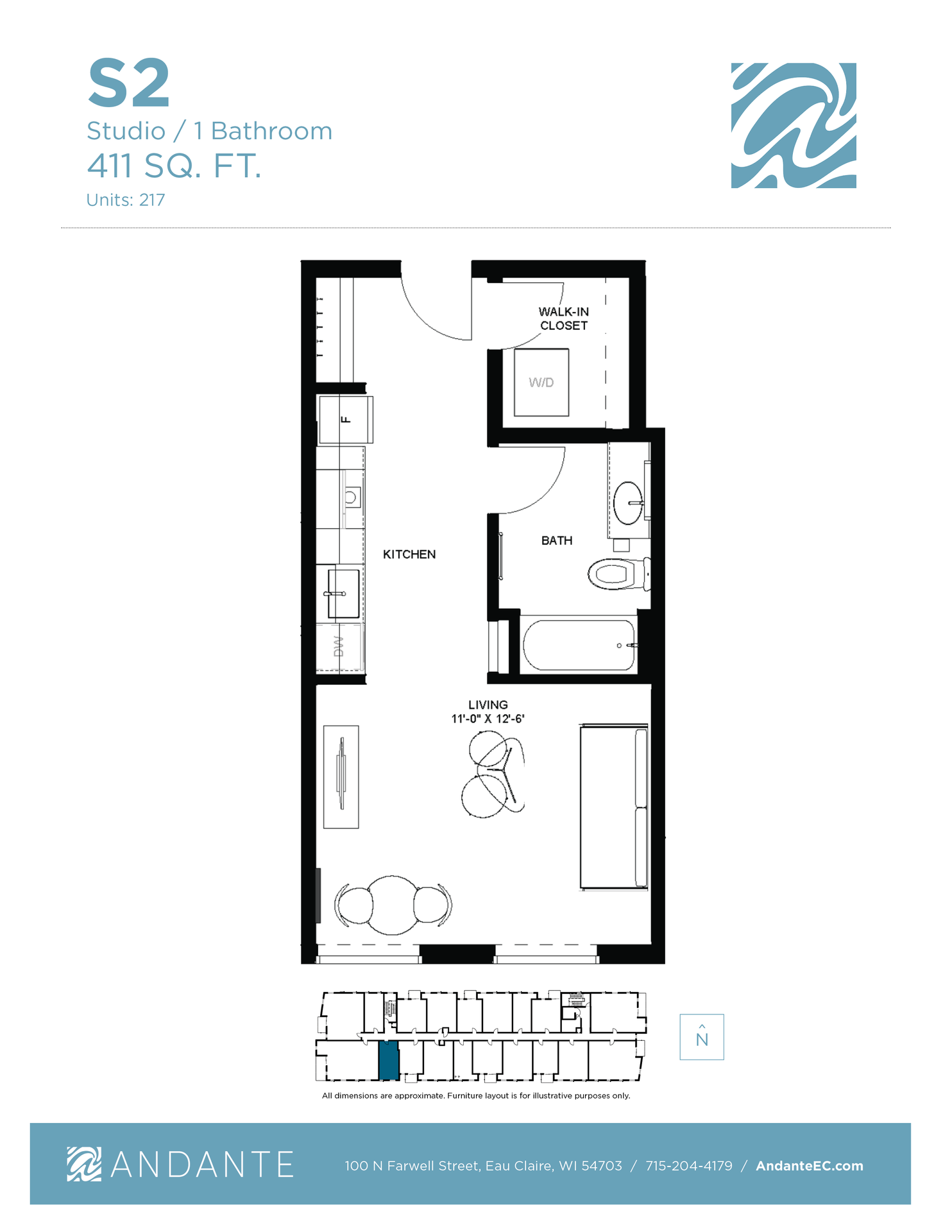 This is a Studio unit located in Andante, a 5-story mixed-use development located at 100 N. Farwell Street, in the heart of downtown Eau Claire. The project includes 76 residential units, including furnished studios, one-bedroom units, and two-bedroom units. The first floor of the building includes over 8,000 leasable square feet of commercial space.